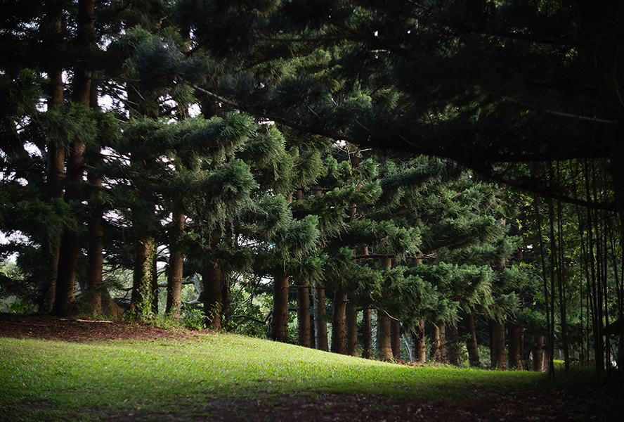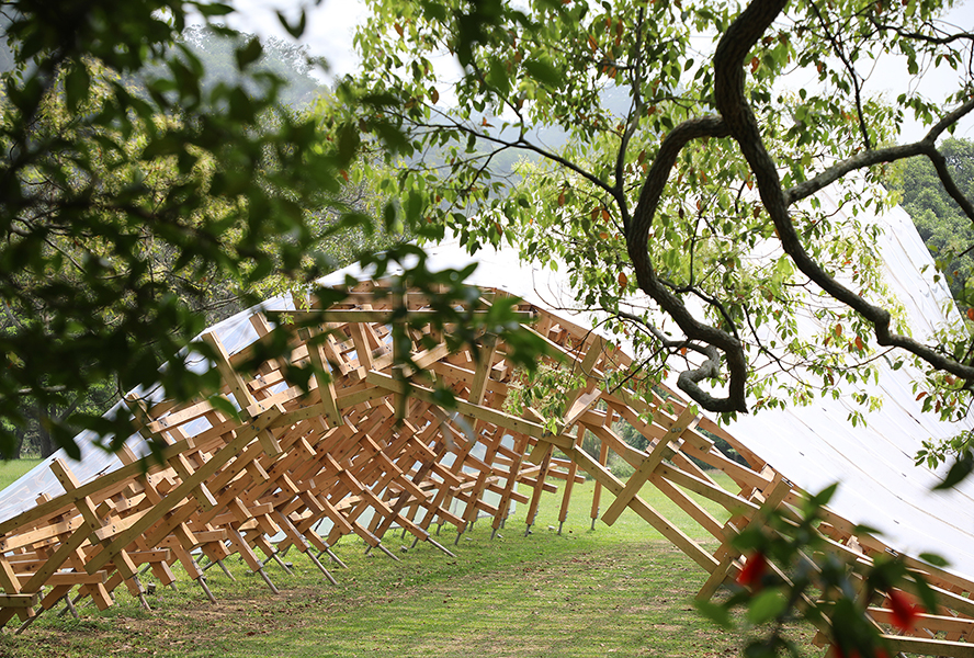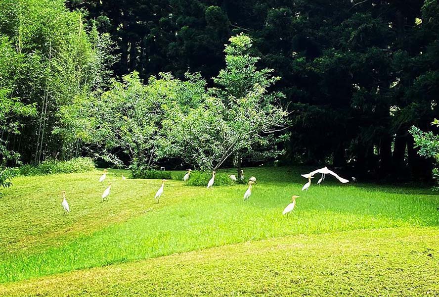 27公頃無盡綠意中有彩蝶撲翅、錦鱗遨遊,但見園內臺灣原生植物爭先盛放,與九重山相映成趣。感懷於場域生命力,日本建築師隈研吾以全檜木創作在臺首件連結式大地藝術「風檐」,以連接天地人的意象,與漢寶德的南園致敬。